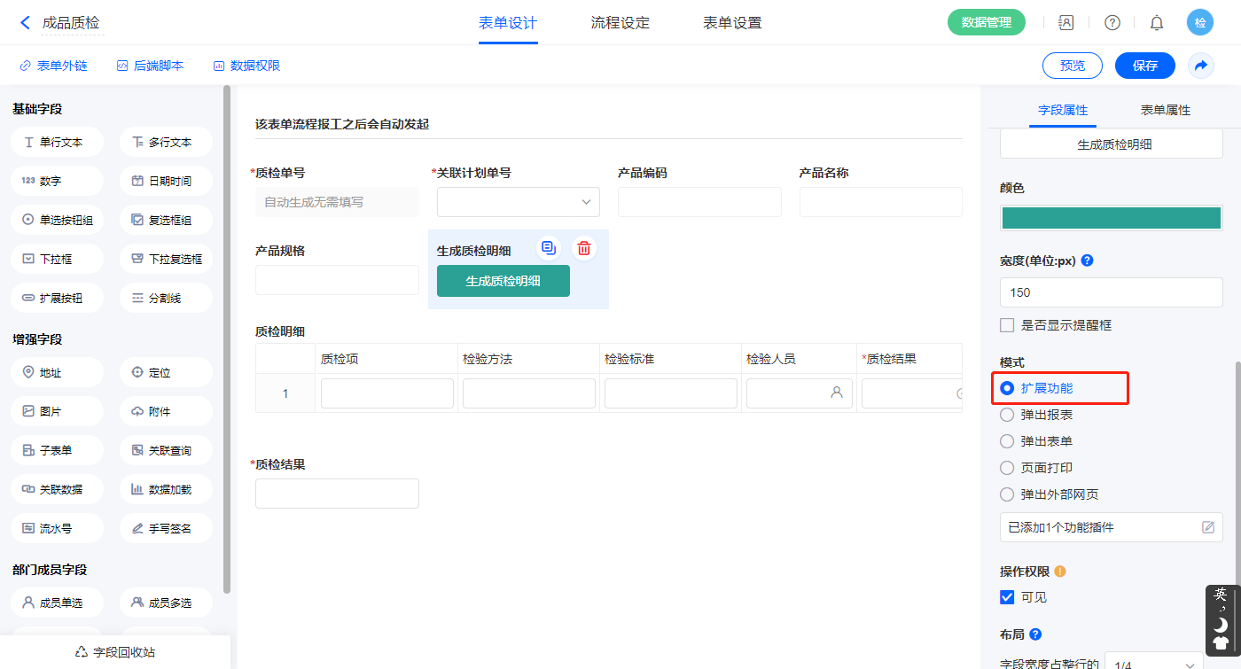 3)【生成质检明细】扩展按钮,模式选择扩展功能;
