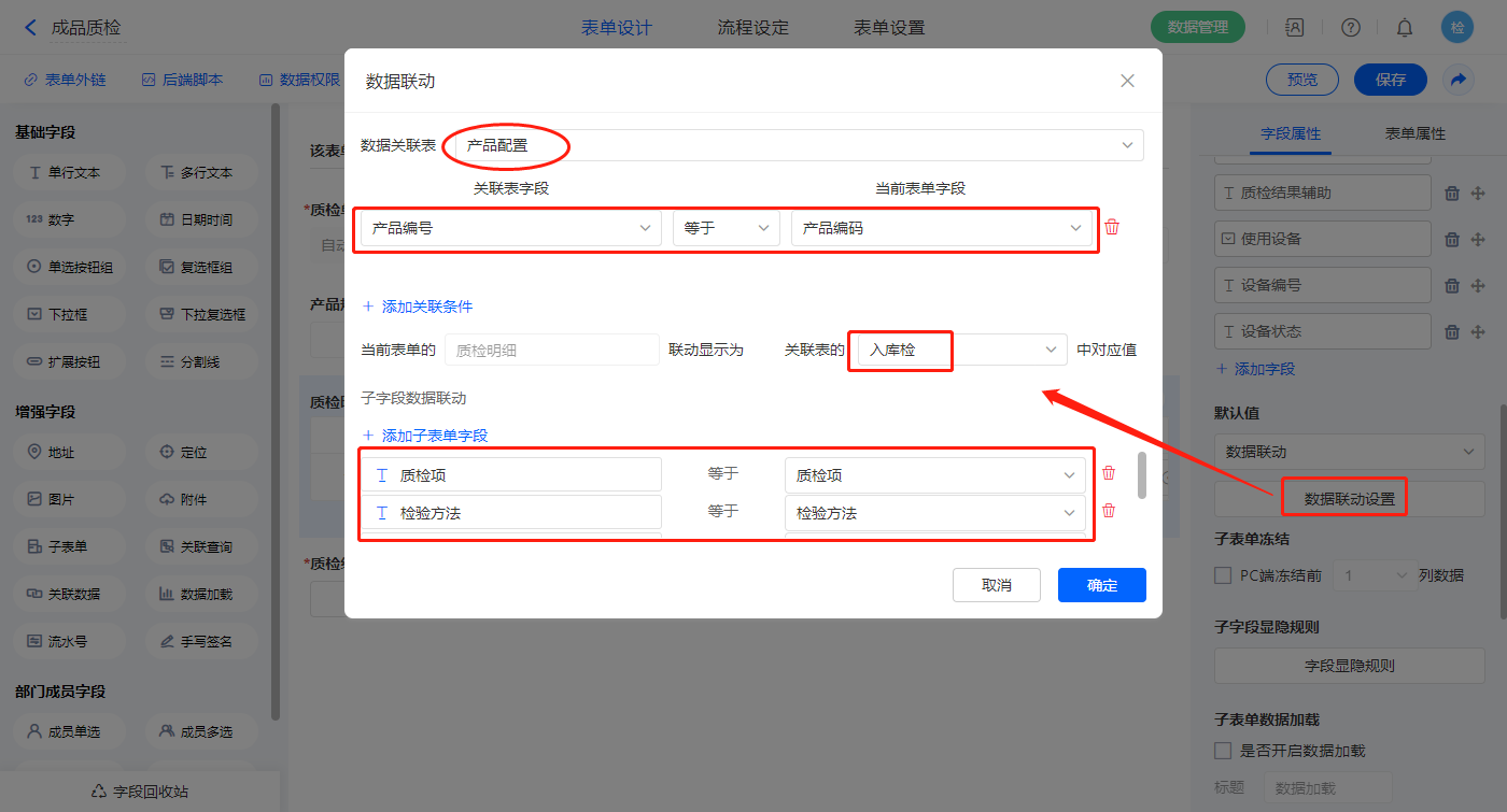 4)【质检明细】子表单字段,设置默认值为数据联动,关联表及关联条件相同,设置对应的联动字段即可;