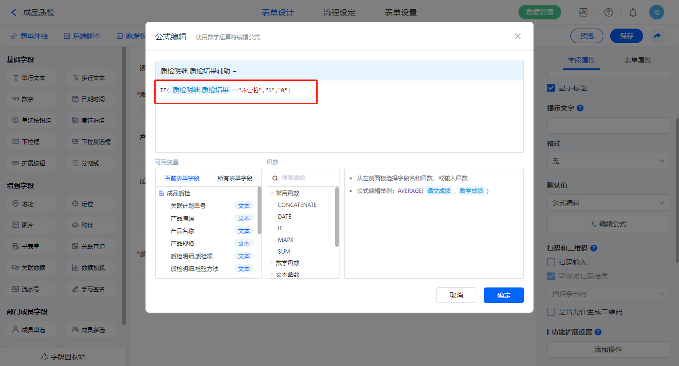 2)【工序质检明细.质检结果辅助】字段,设置默认值为公式编辑,设置公式:“IF(工序质检明细.质检结果=="不合格","1","0")”;