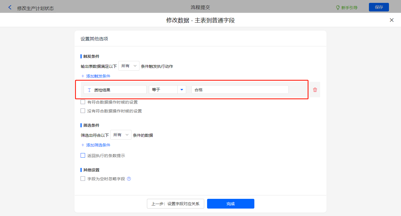 其他设置触发条件为【质检结果】字段等于合格,设置好点击【完成】并保存该数据助手;