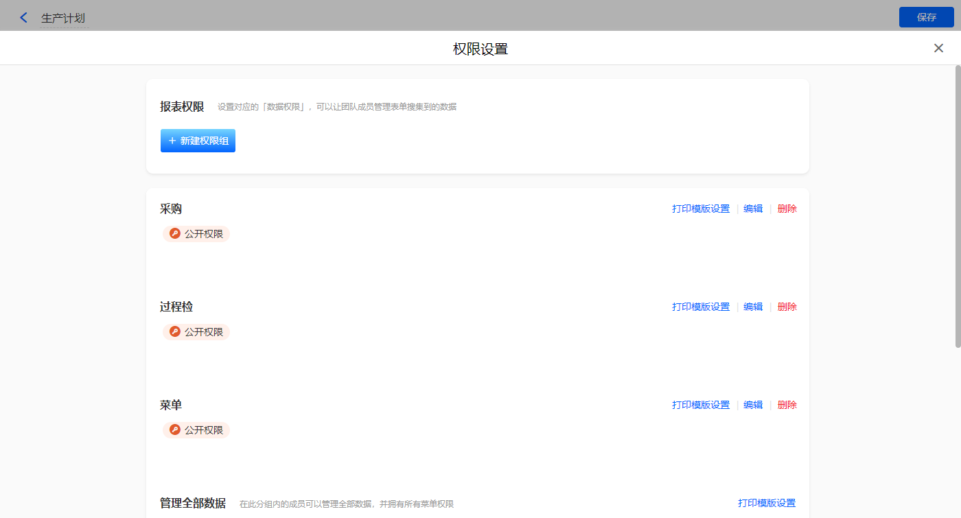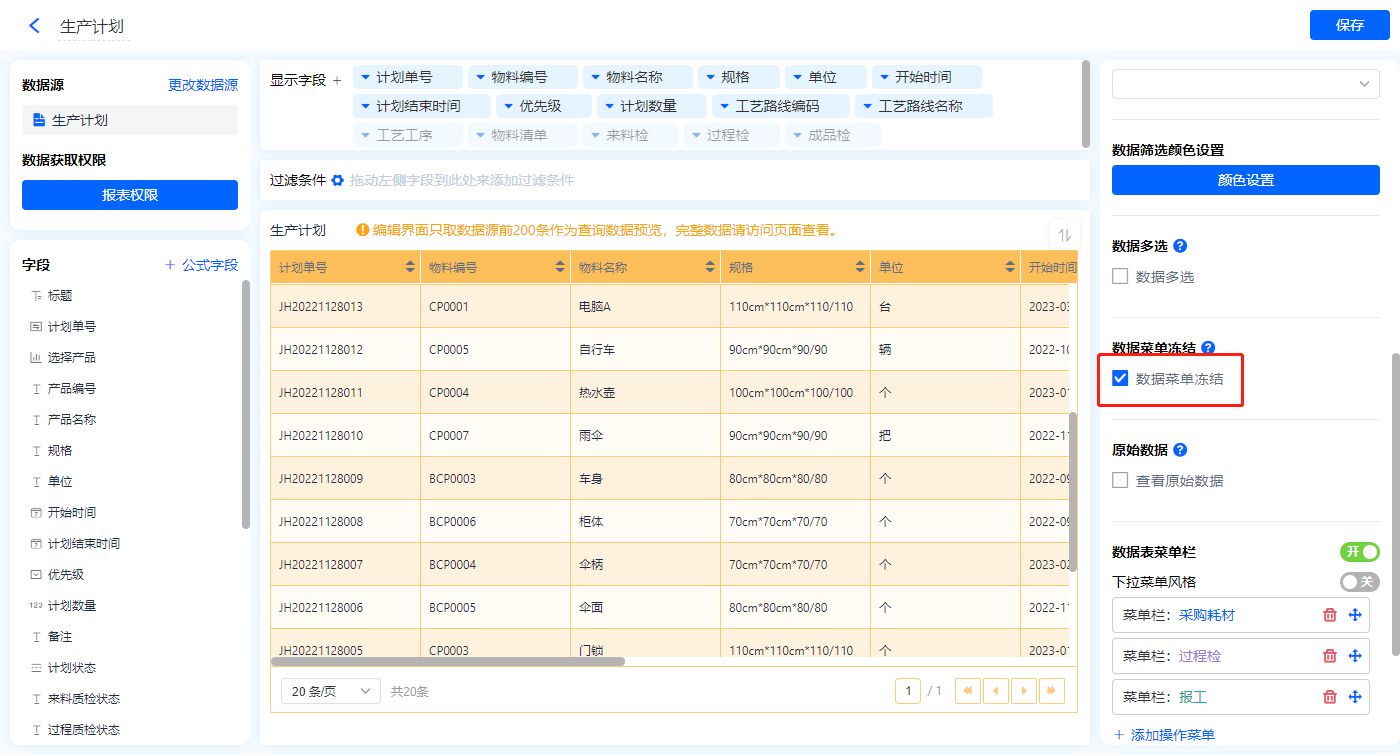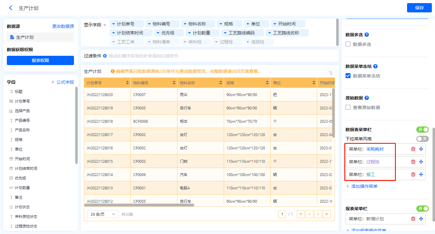 1)新增【生产中计划】报表,用基础报表【数据表】展示数据源为表单【生产计划】的数据;