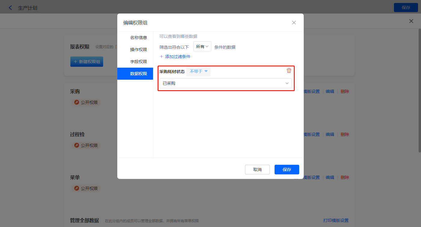 采购数据权限添加过滤条件,【采购耗材状态】不等于已采购;