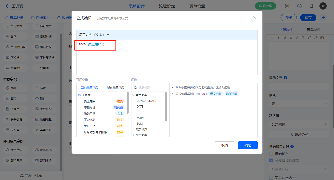 【员工姓名(文本)】字段,默认值选择公式编辑,如图设置公式;