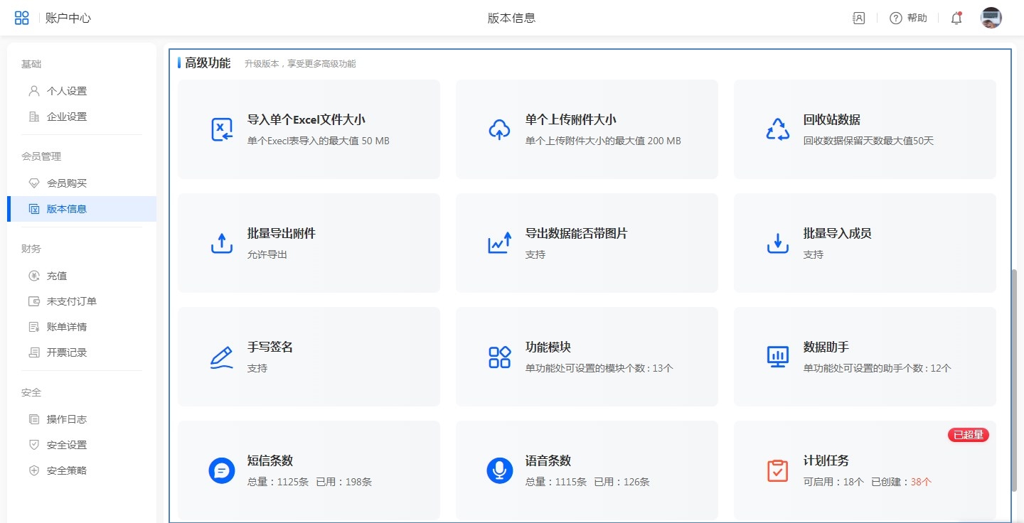 展示了当前系统的一些付费功能,有需要可以升级:鼠标放置在功能上出现升级按钮,点击升级即可进入升级页面,购买会员和升级参考上面会员管理章节。