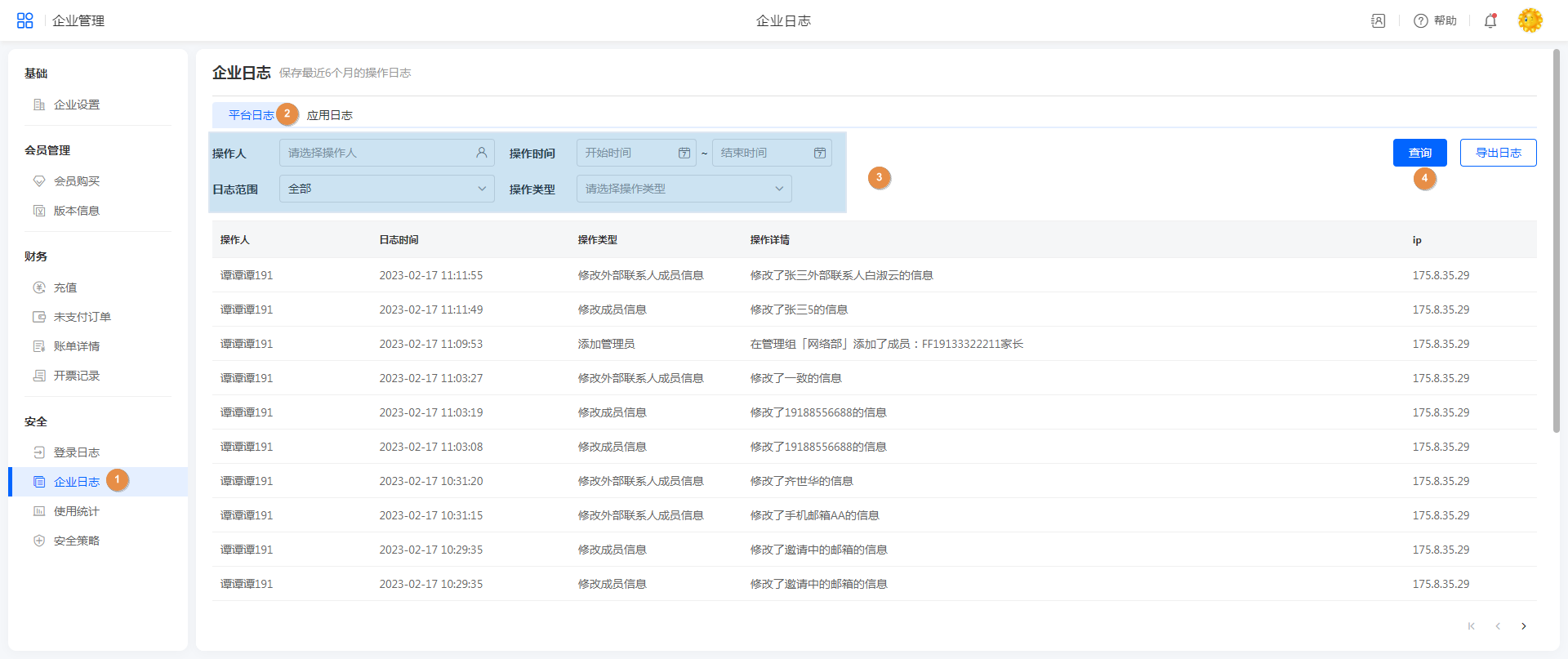 | 操作时间 | 可以选择任意时间段的企业日志。 |