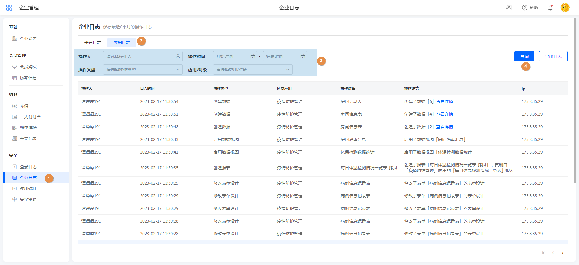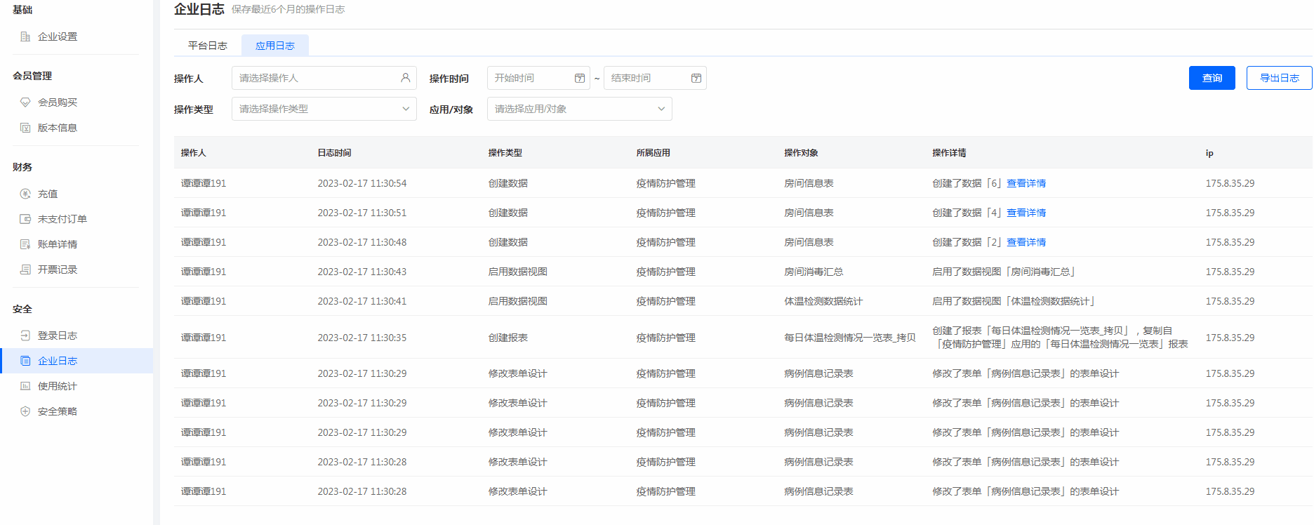 - 应用日志:平台应用内操作的日志,包含应用、表单/报表、数据视图、聚合表等模块的操作日志。