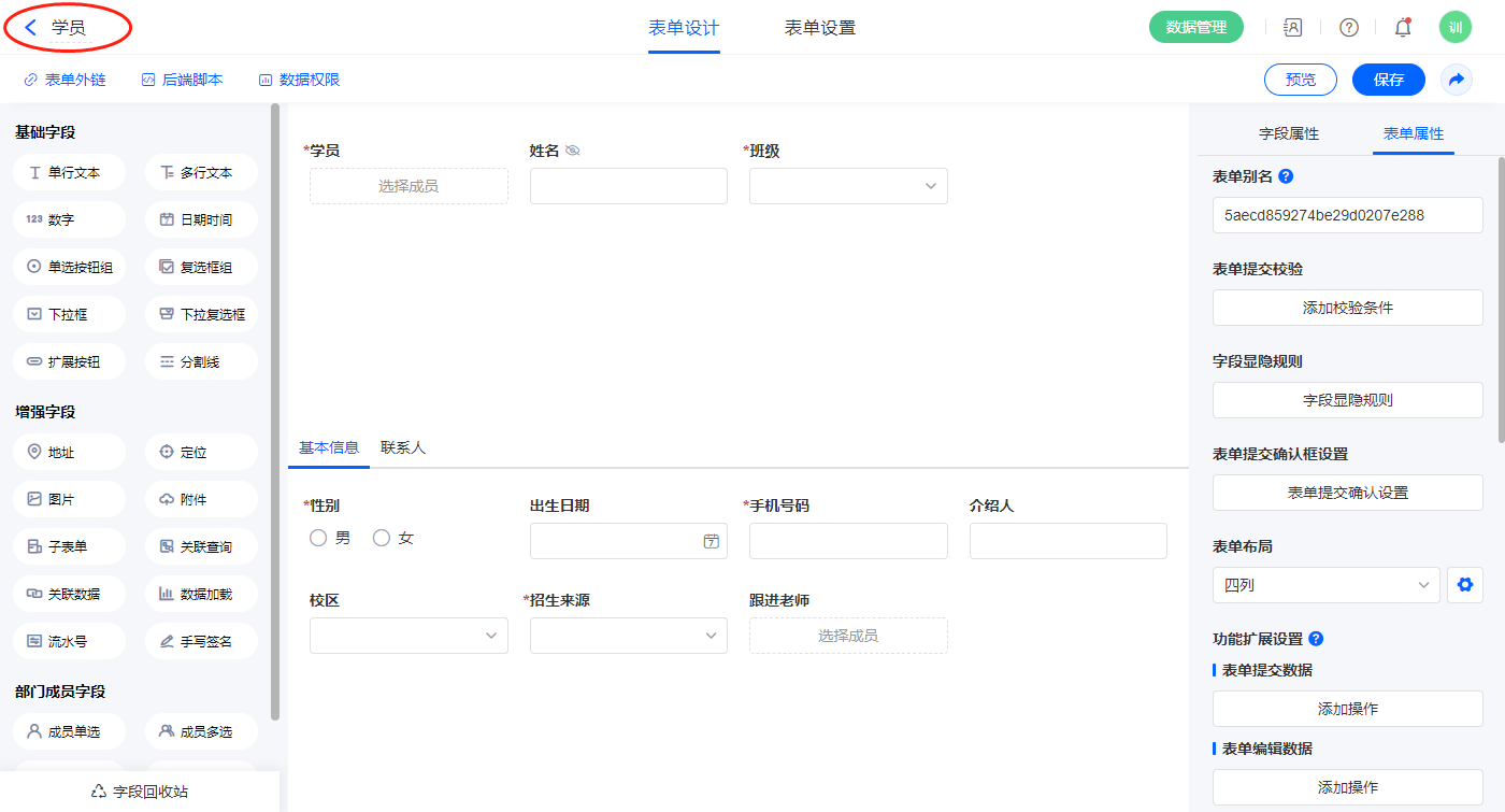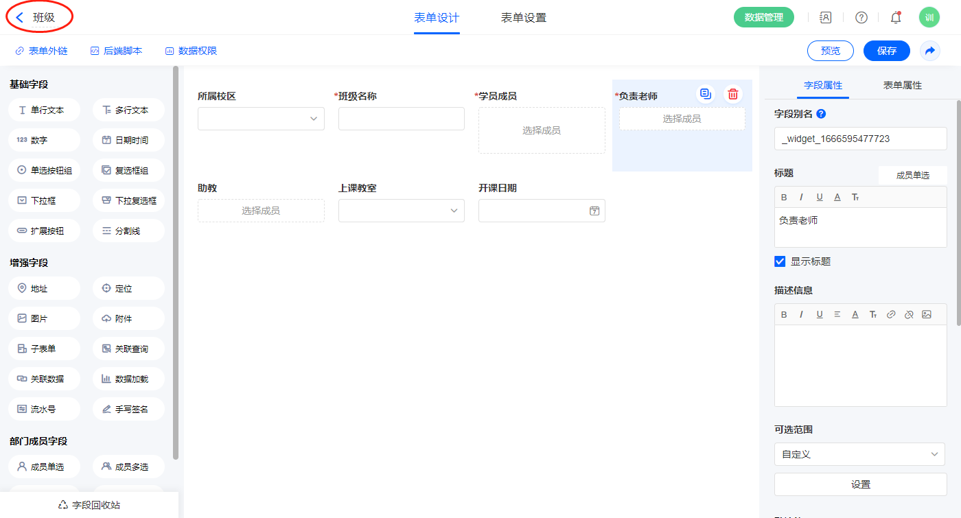 1)【班级学员】字段,设置默认值为数据联动,设置联动条件及联动字段,该字段为不可见字段;