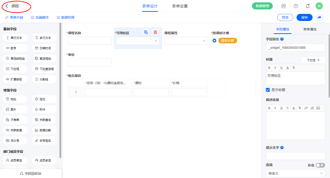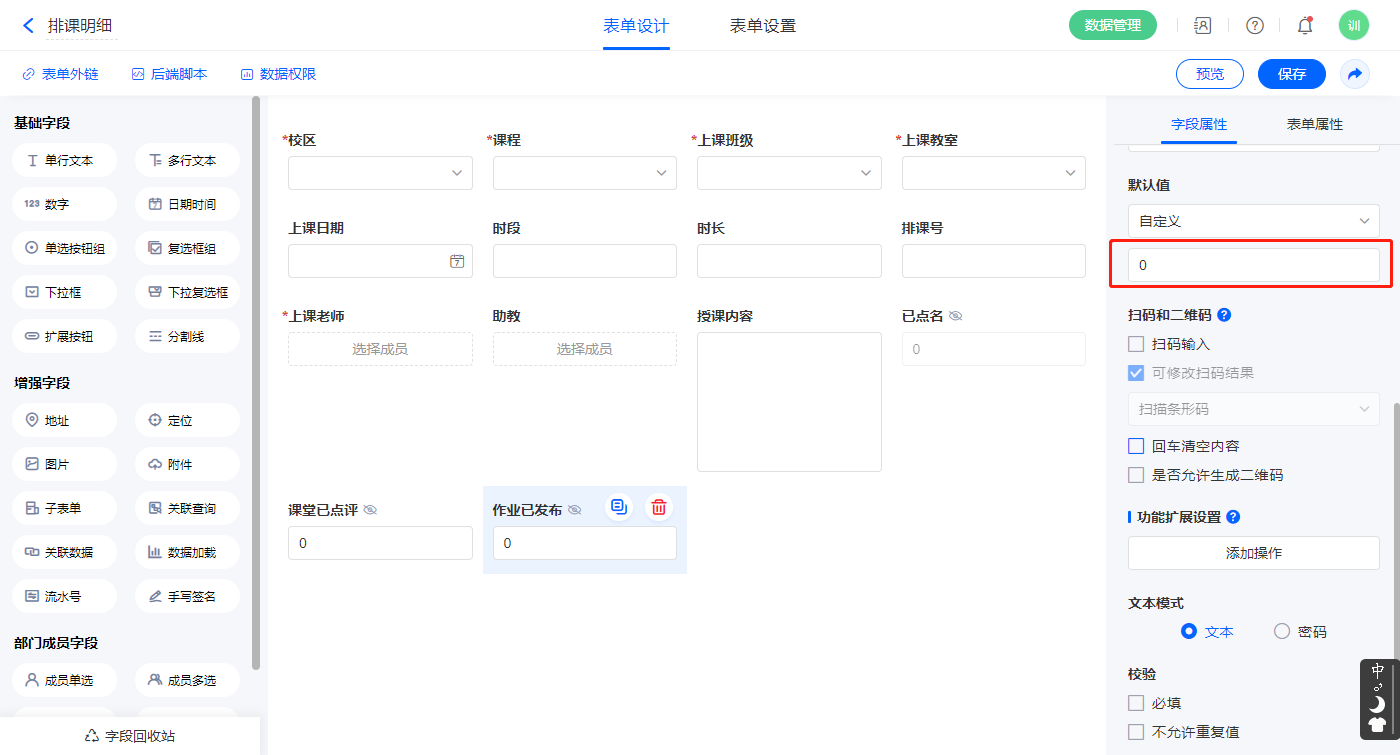 【授课课时】字段,默认值选择公式编辑,如图设置公式;