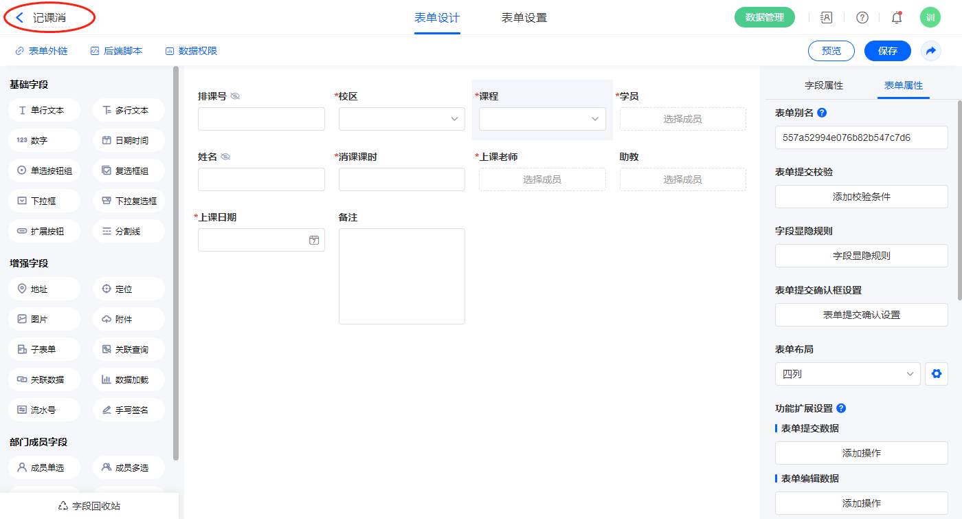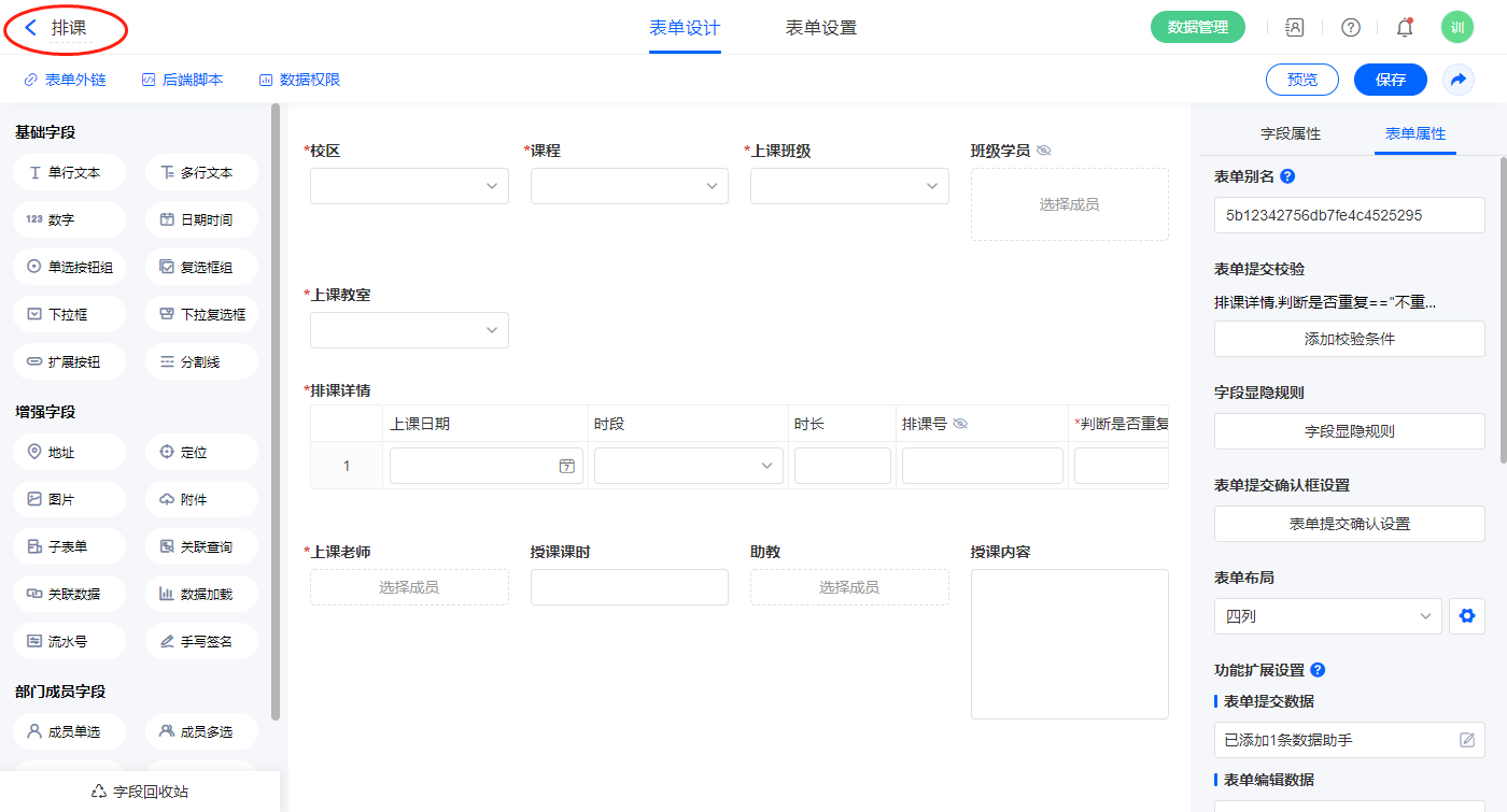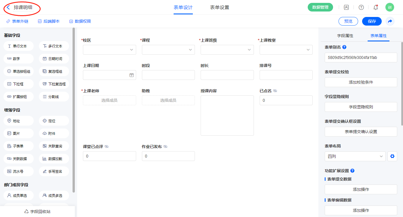 1)新增【课堂信息表】报表,用基础报表【数据表】展示数据源为表单【排课明细】的数据;