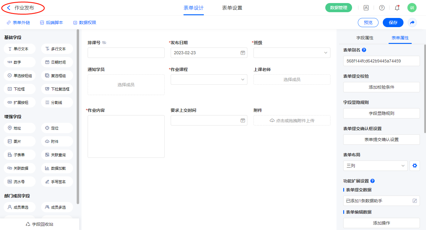 【作业发布】的菜单栏,操作模式设置为弹出表单【作业发布】;
