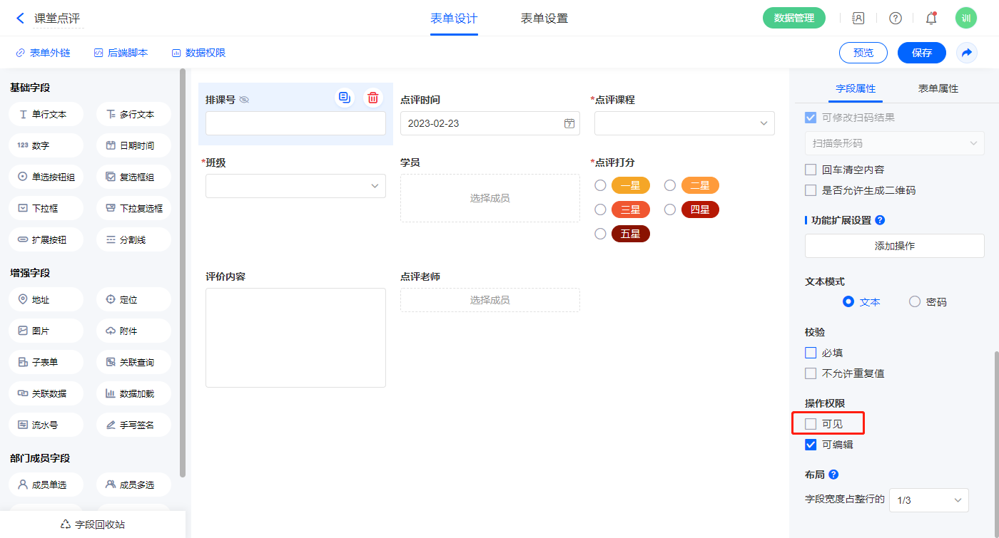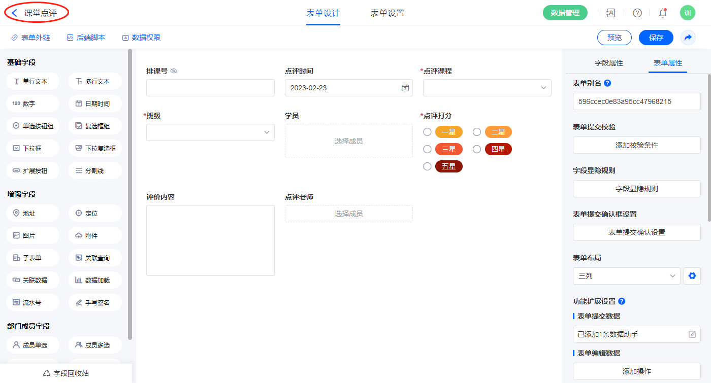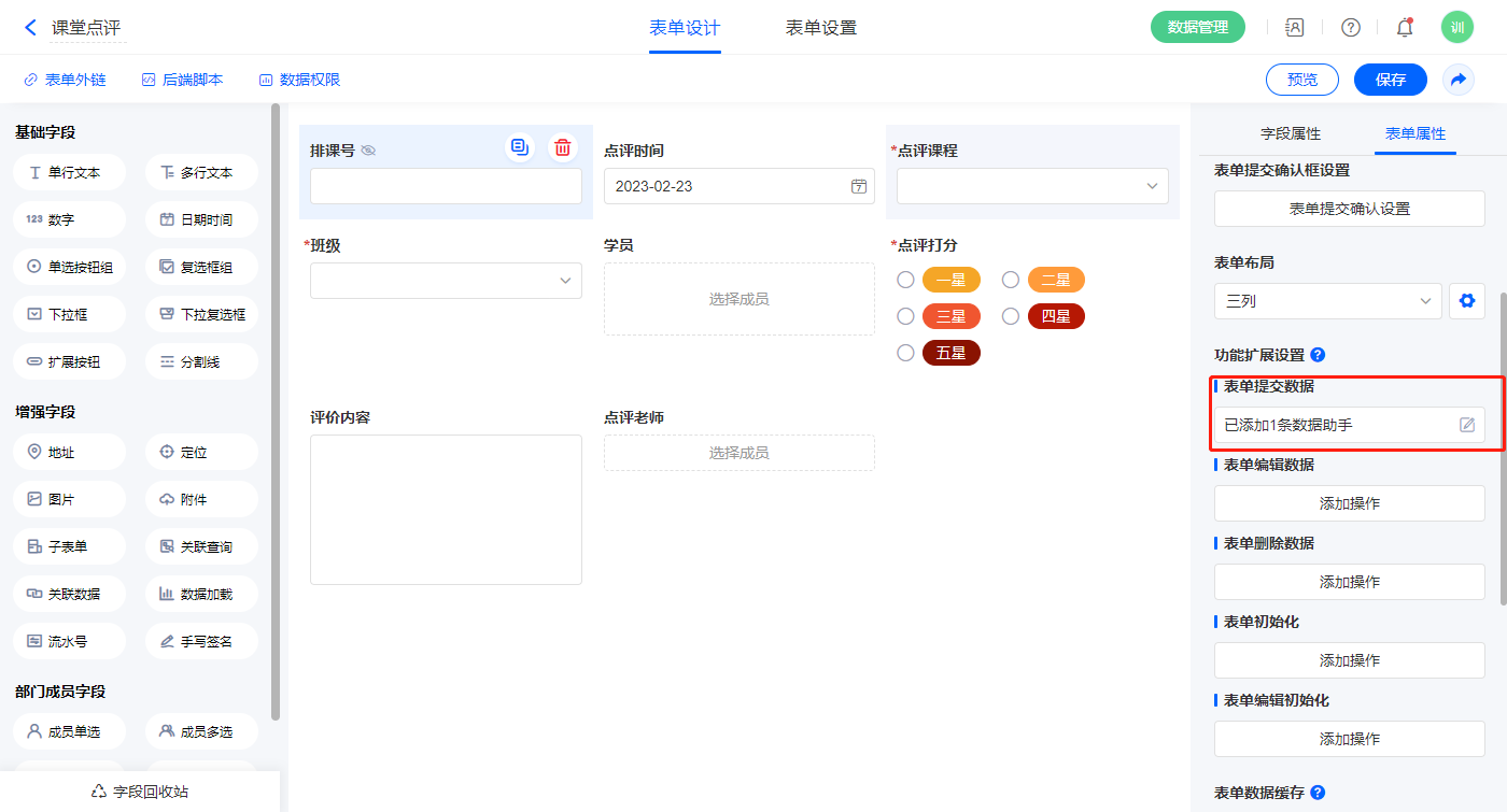 【课堂点评】的菜单栏,操作模式设置为弹出表单【课堂点评】;