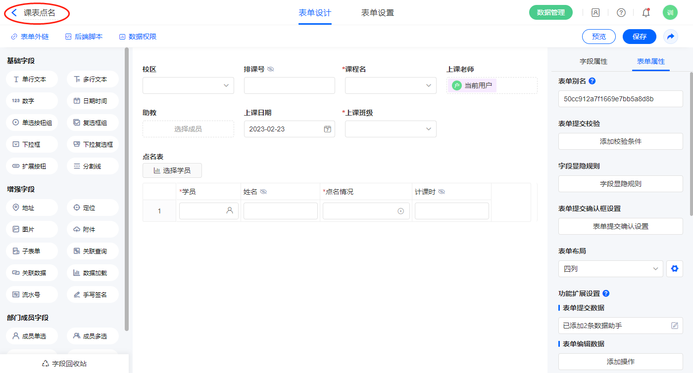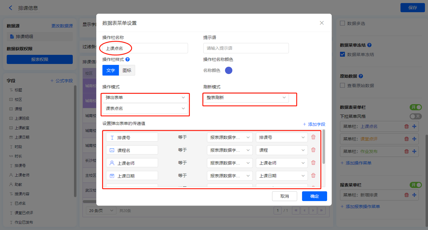 【上课点名】的菜单栏,操作模式设置为弹出表单【课表点名】;