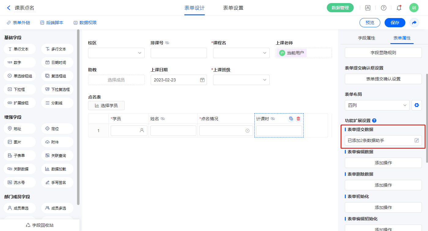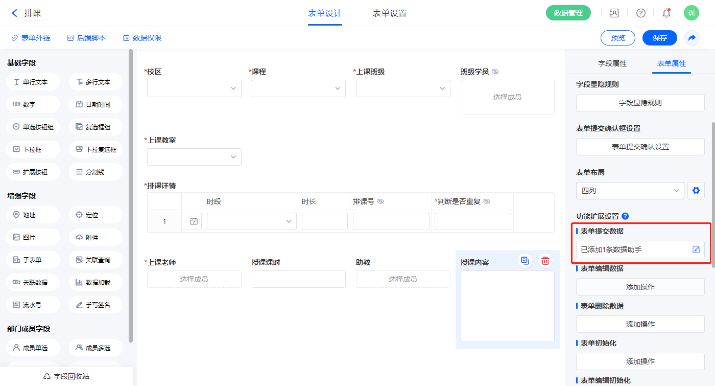 新增新增数据的执行动作,选择目标表单【排课明细】,对应赋值字段,设置好点击【完成】并保存该数据助手;