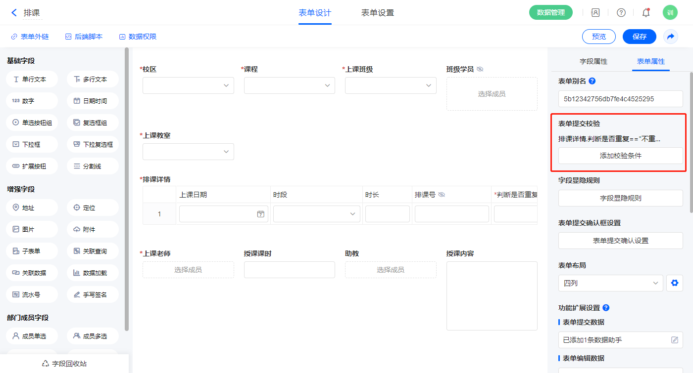 当公式“排课详情.判断是否重复=="不重复"”不满足提交时报“该时段已排课!”提示;