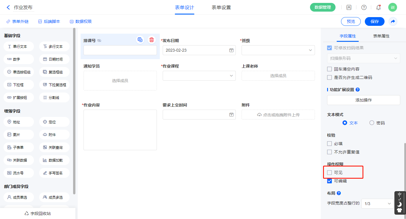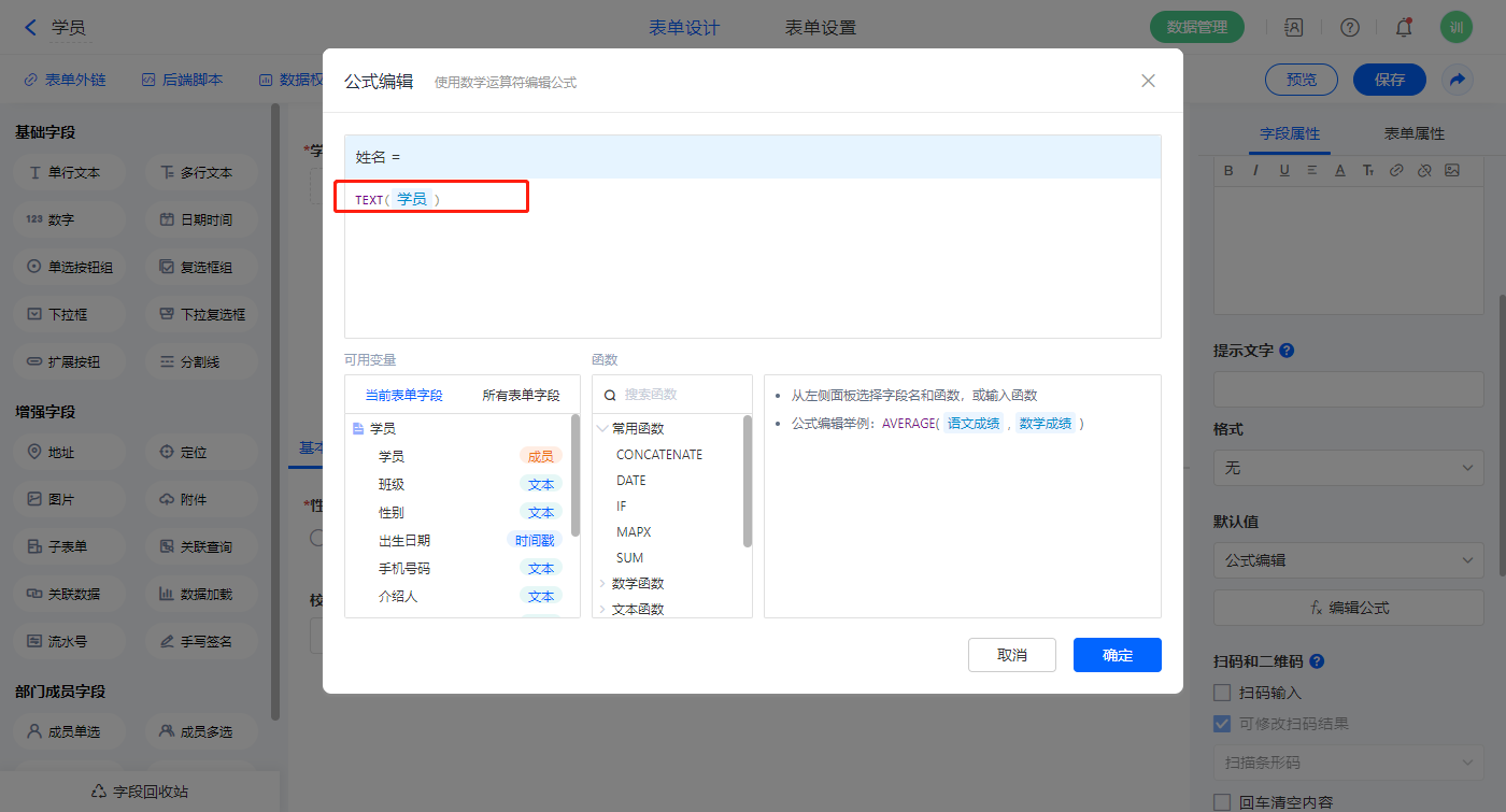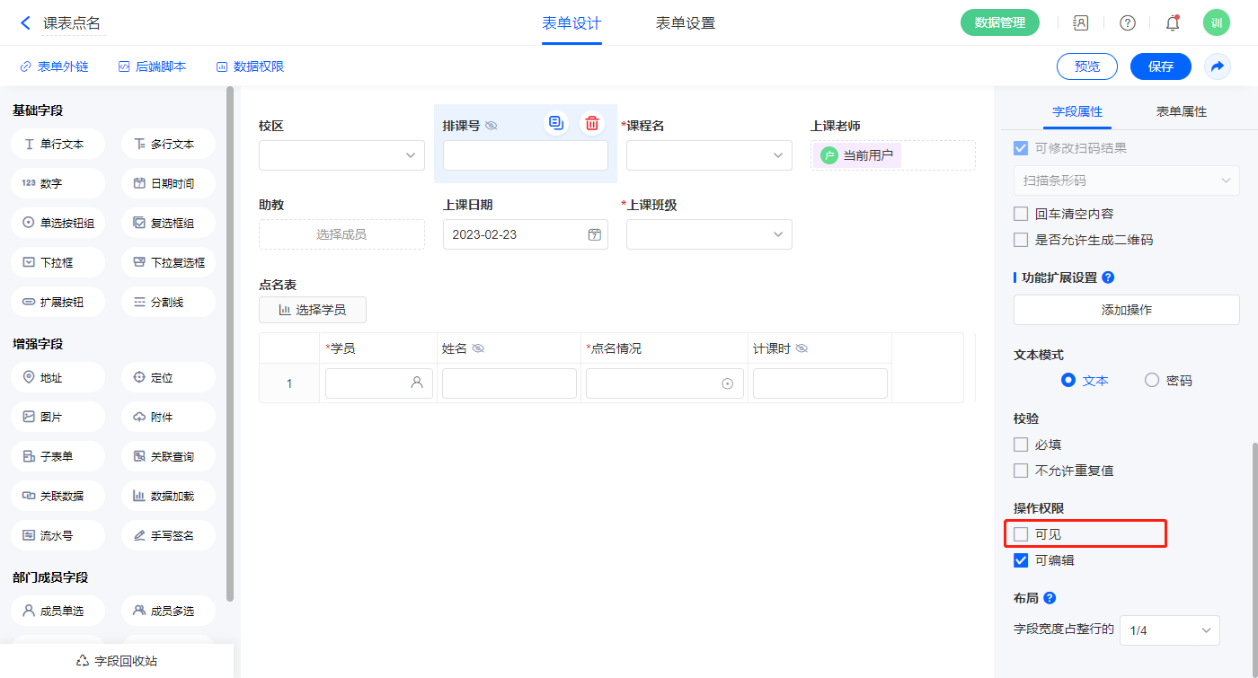 【点名表.姓名】字段,默认值选择公式编辑,如图设置公式,并设置操作权限为不可见;