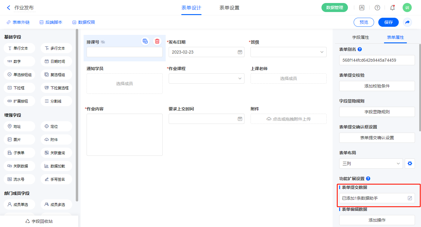 2)表单提交设置1条数据助手,名称为修改课堂状态;
