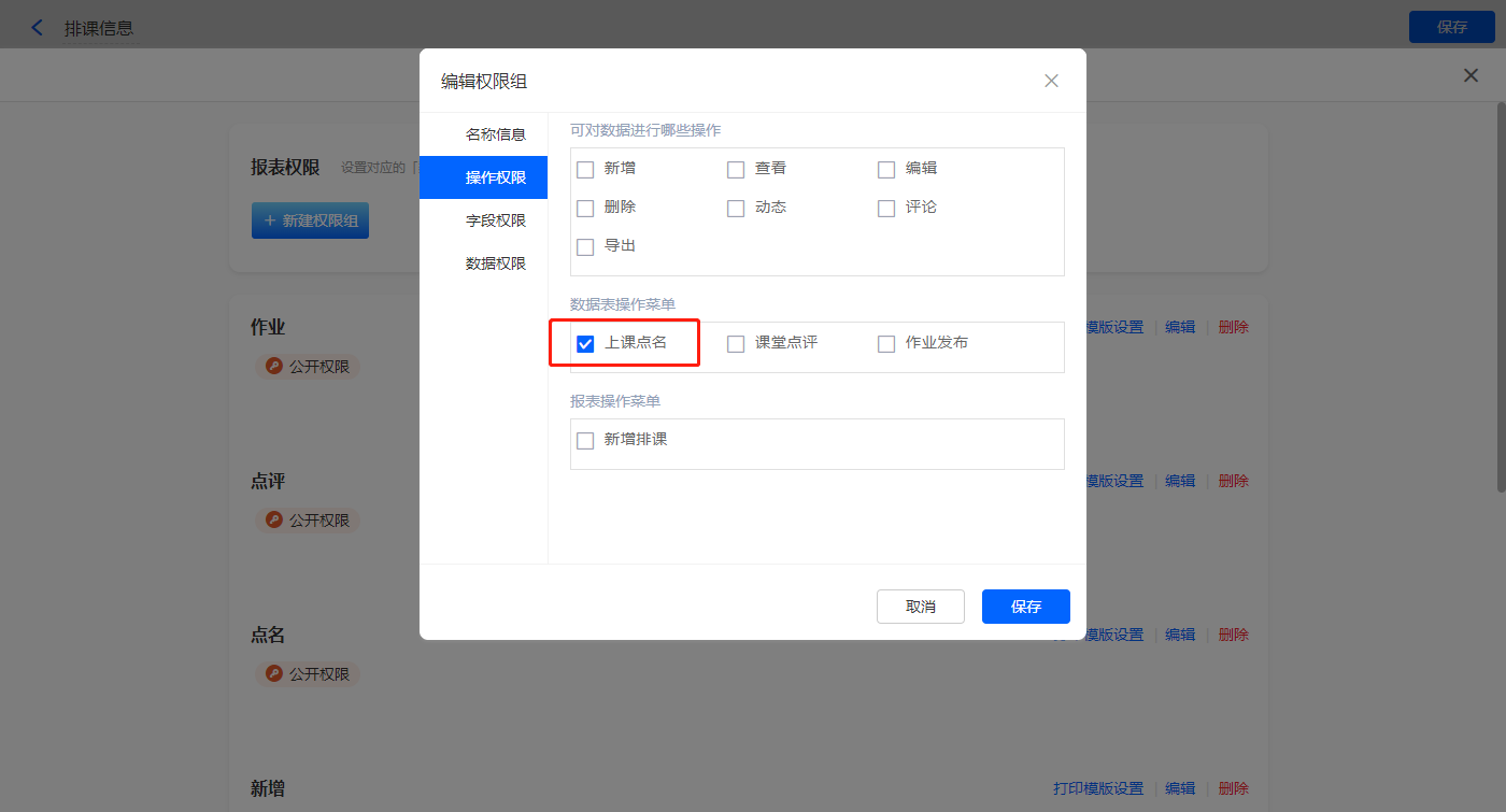 设置报表的权限,填入权限组名称作业,选择可操作的数据表菜单;