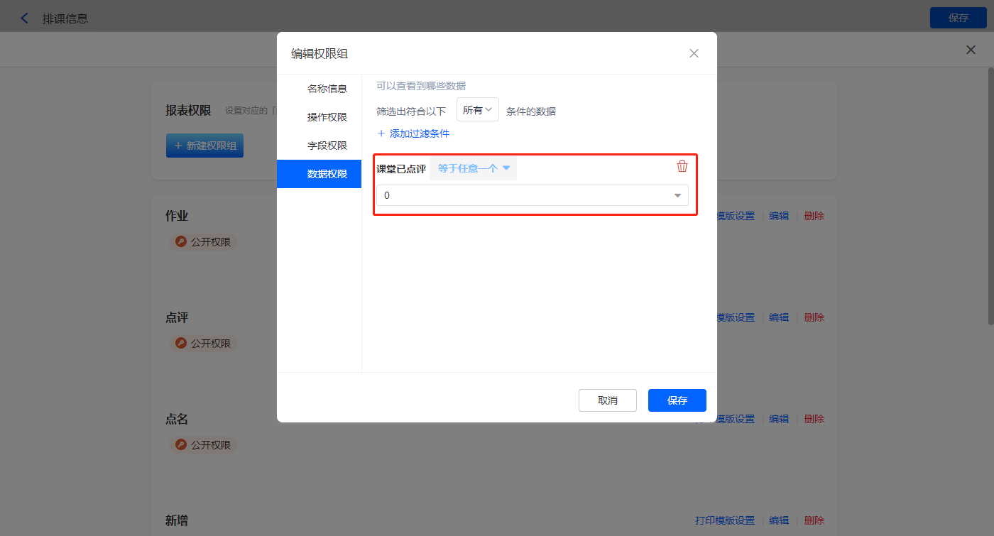 数据权限添加过滤条件,【课堂已点评】等于0;