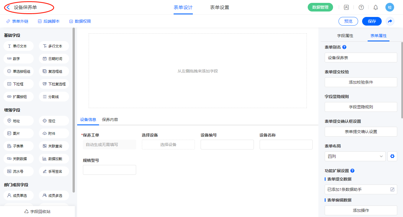 • 2.3、表单【设备保养单】字段及表单属性设置
