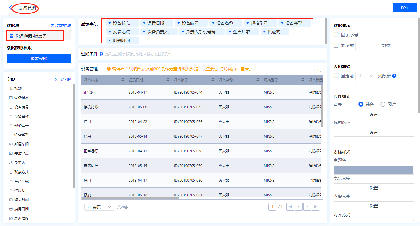 1)【选择设备】数据加载字段,数据源为【设备档案-履历表】,添加显示字段设置赋值字段,点击保存;