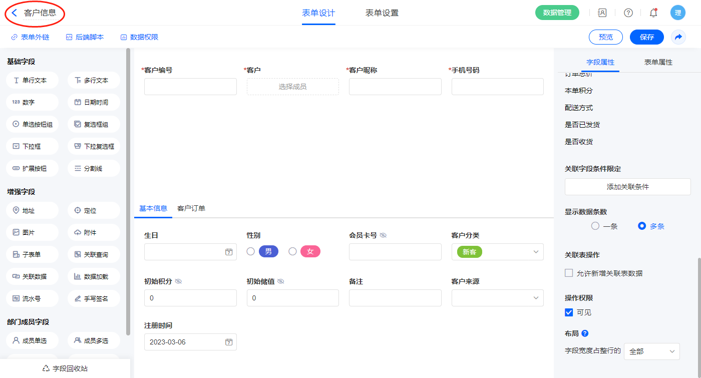 2)【客户编号】字段,设置默认值为数据联动,设置联动条件及联动字段;