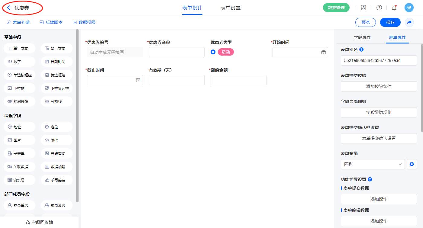1)新增【优惠券】报表,用基础报表【数据表】展示数据源为表单【优惠券】的数据;
