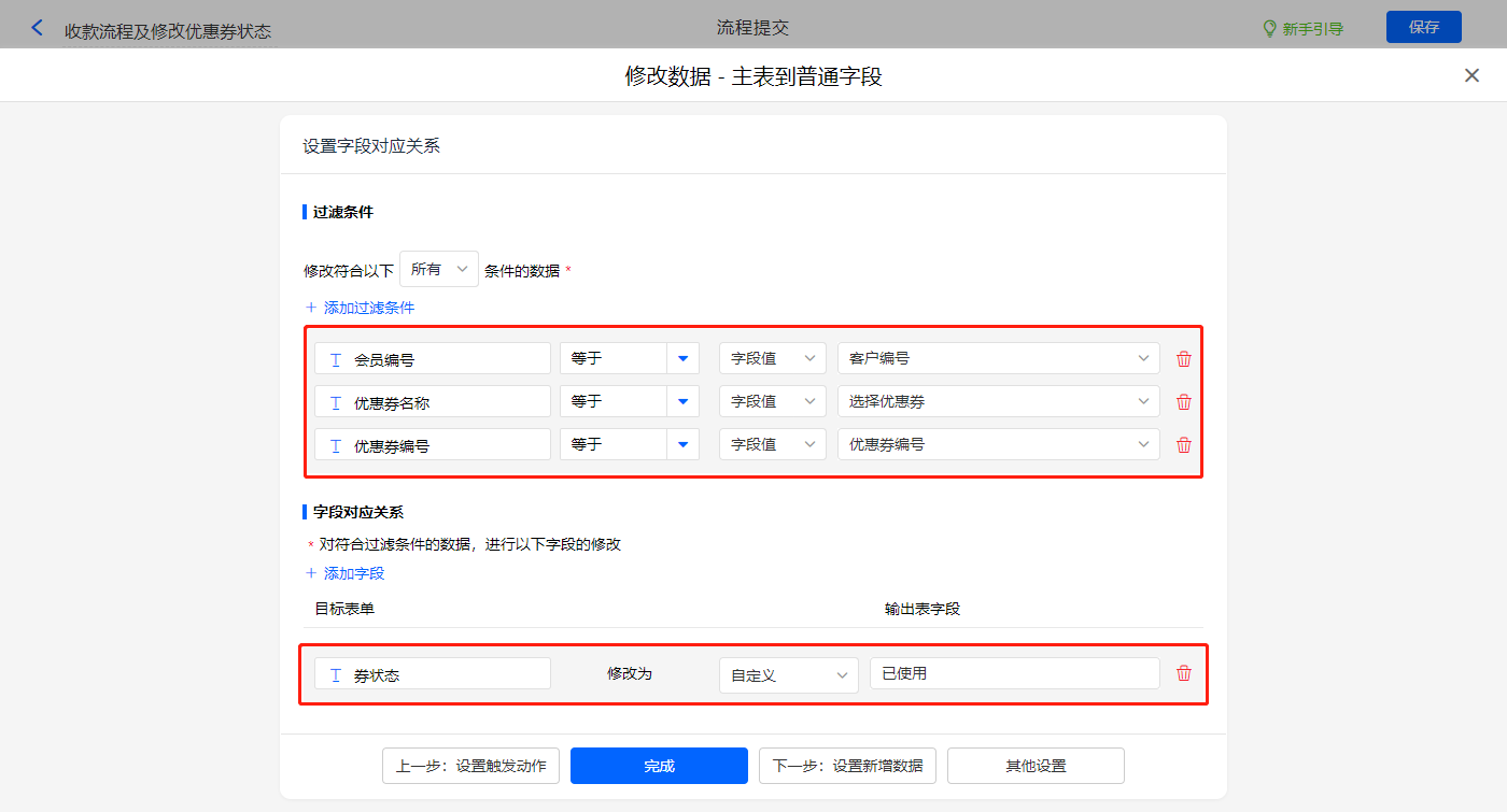 新增修改数据的执行动作,选择修改【领取优惠券】表单,选择对应过滤条件,以及需要修改的字段;