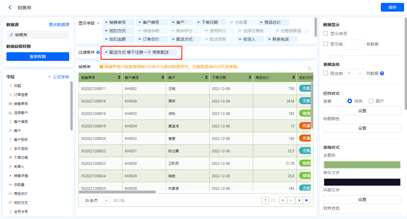 1)参照2.8、【自提销售单】表单的搭建方式,变更数据表的过滤条件为【配送方式】等于商家配送;