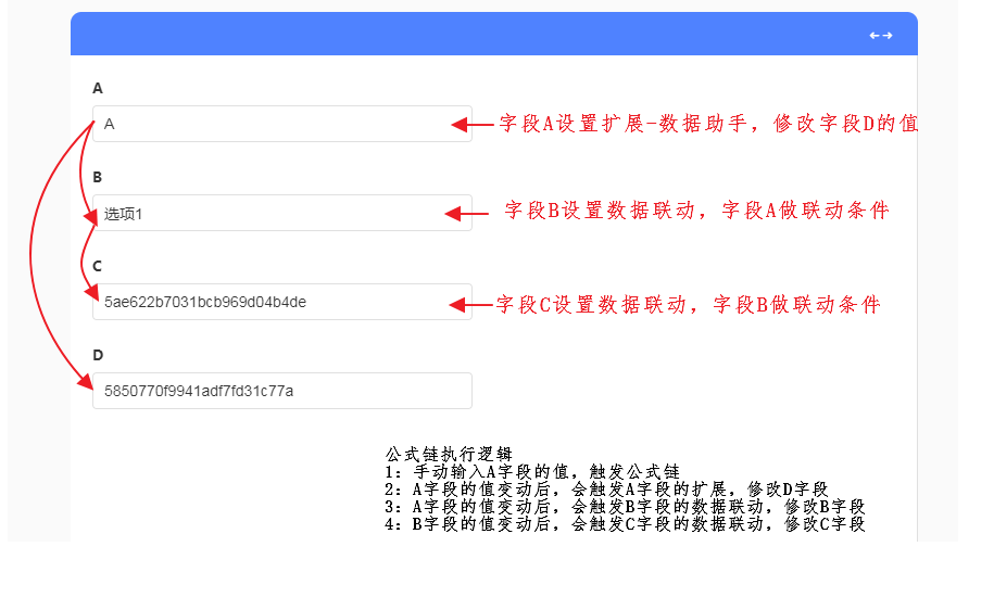 如存在表单设计,字段B设置数据联动(字段A做条件),字段C设置数据联动(字段B做条件),字段A设置扩展-数据助手修改字段D的值