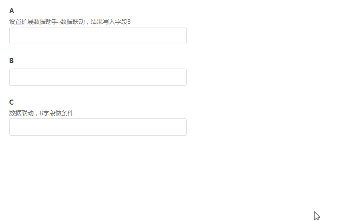示例:A B C三个字段,A字段的扩展修改B字段,C字段设置数据联动(以B字段作为联动条件),当手动修改A字段的值后,触发扩展修改B字段,B字段的值变动后触发C字段的数据联动。