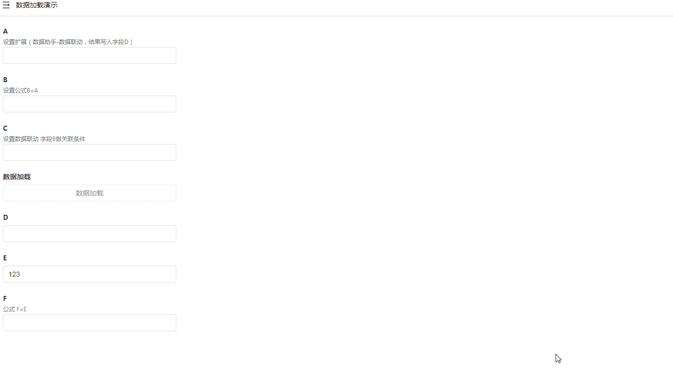 数据加载给字段A赋值后,字段B C的公式/数据联动会执行,字段A的扩展不会执行,字段F的公式不会执行。