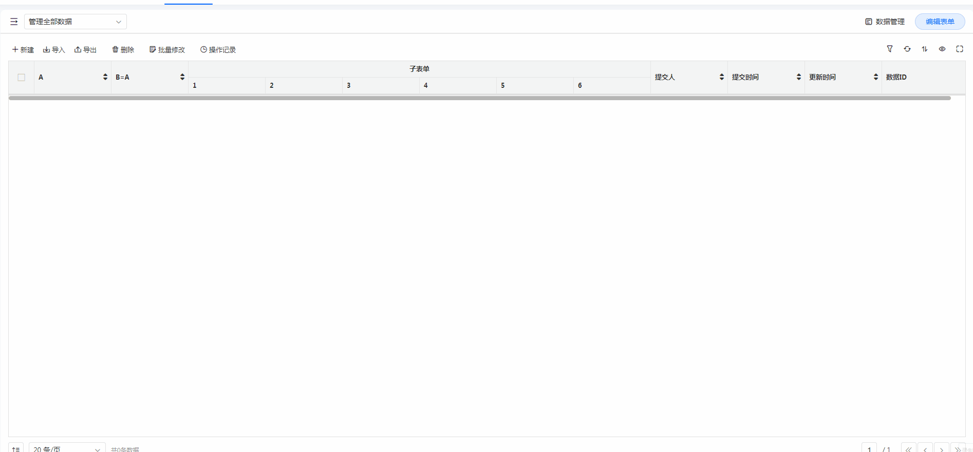 示例,表单设计,存在普通字段A、B,子表单(子字段1、2、3):