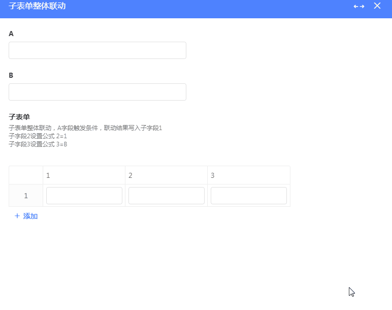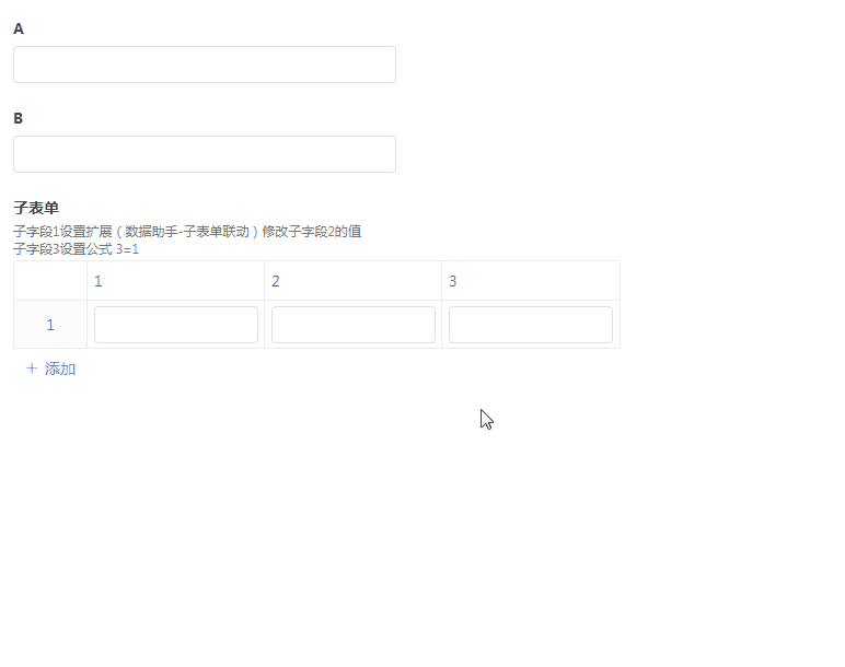 当输入A触发子表单整体联动后,所有行记录中,子字段2/3的公式会自动触发。