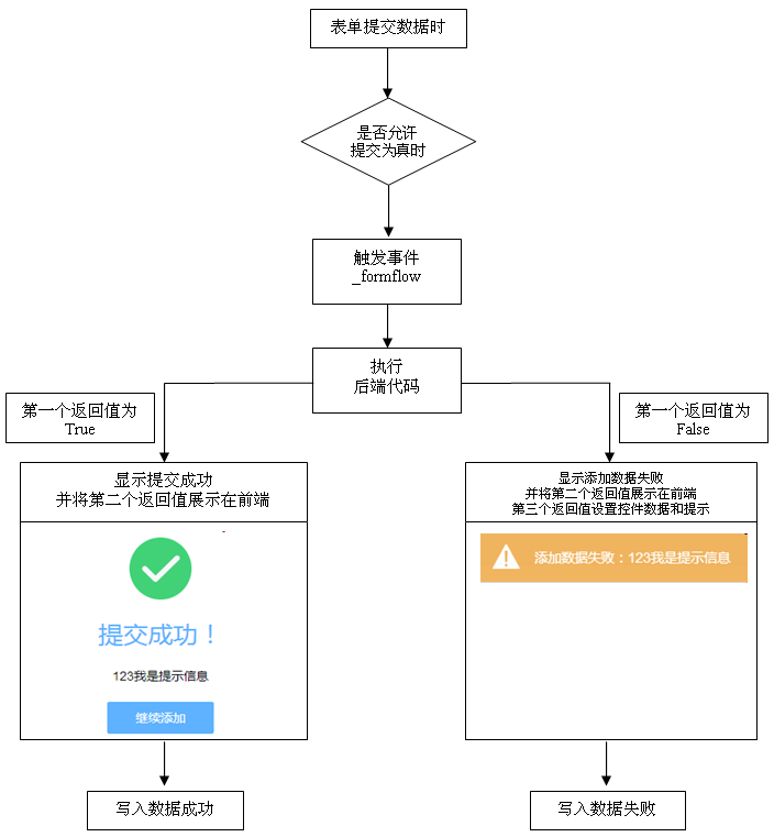 触发事件后,前端页面会将"当前表单别名","表单数据信息","数据提交类型"传给后端对应的云应用中的"_formflow"函数,然后执行"后端代码"并返回"返回结果"和"需要界面展示的数据"。