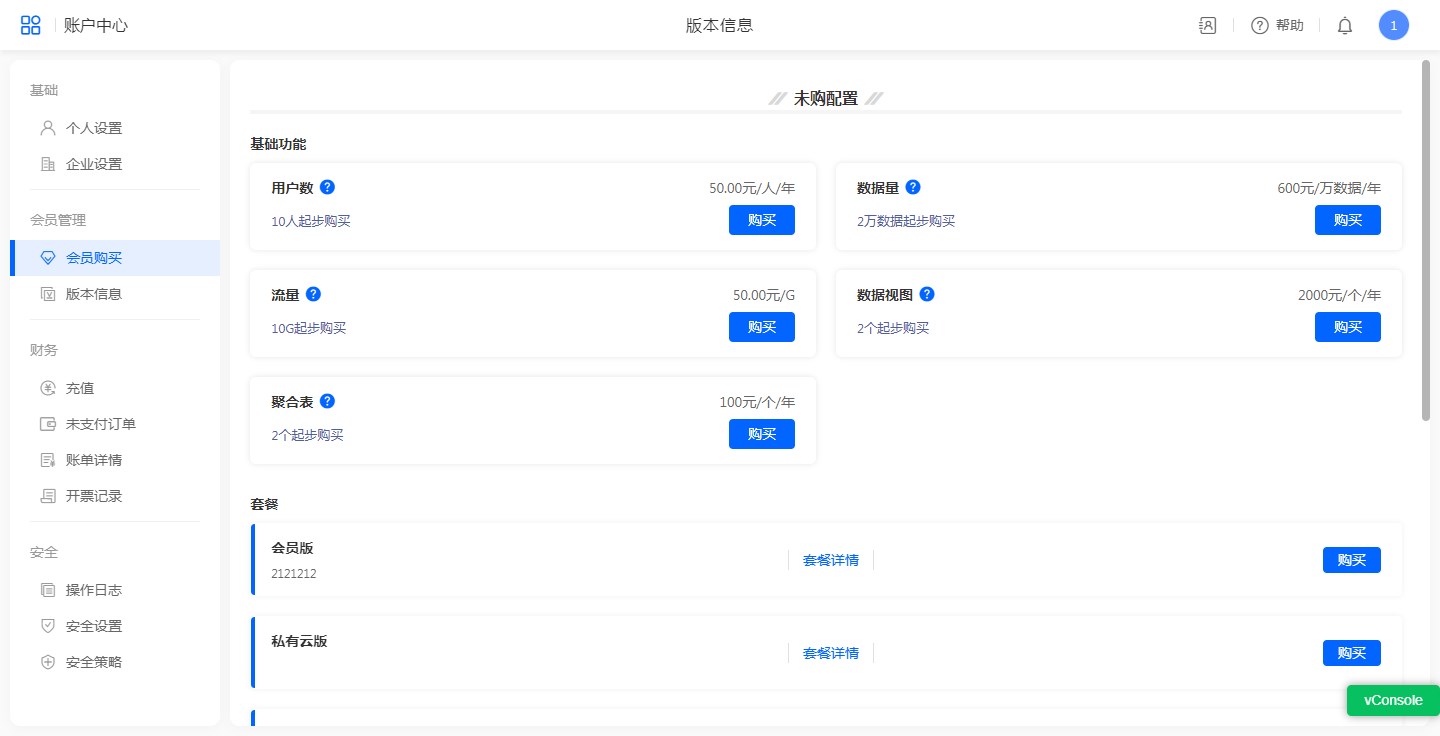 当免费版功能不足以支撑正常使用时,可选择购套餐,可根据需求购买基础功能和套餐。 套餐购买步骤:登录百数官网->点击顶栏右上角的用户头像->会员购买