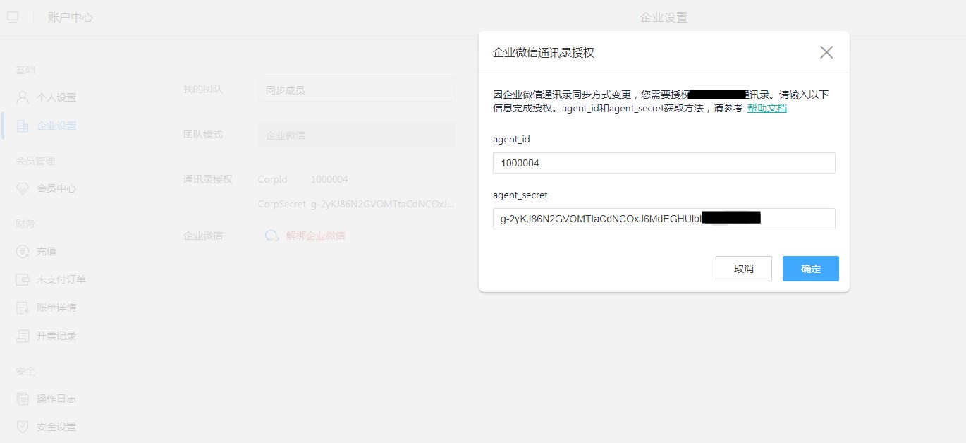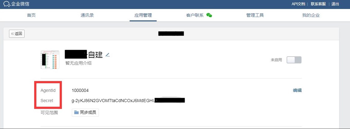 获取 AgentId 和 Secret 参数后,将 AgentId 和 Secret 分别复制到 agent_id 和 agent_secret 中完成绑定。