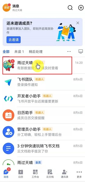 - 在消息列表中,收到推送消息,点击消息可以进行处理。