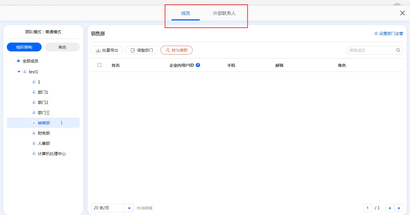 当外部联系人作为普通管理员时,仅能管理外部联系人,无内部通讯录面板!