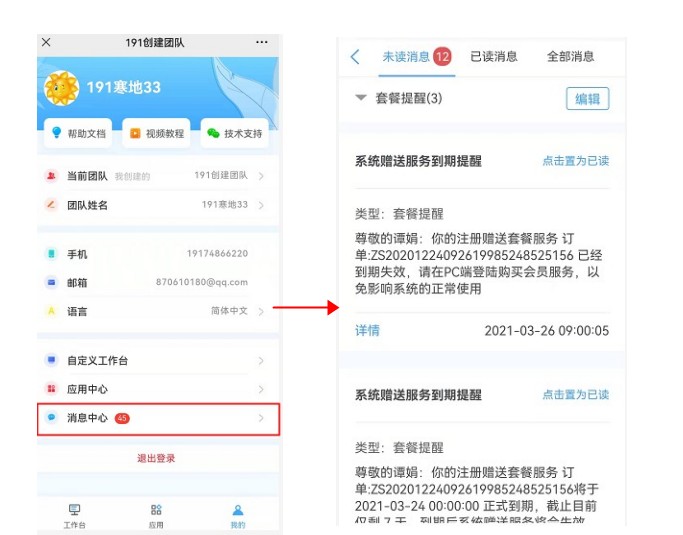 消息中心内可以展示来自团队邀请、@我的、套餐提醒以及系统消息的内容。