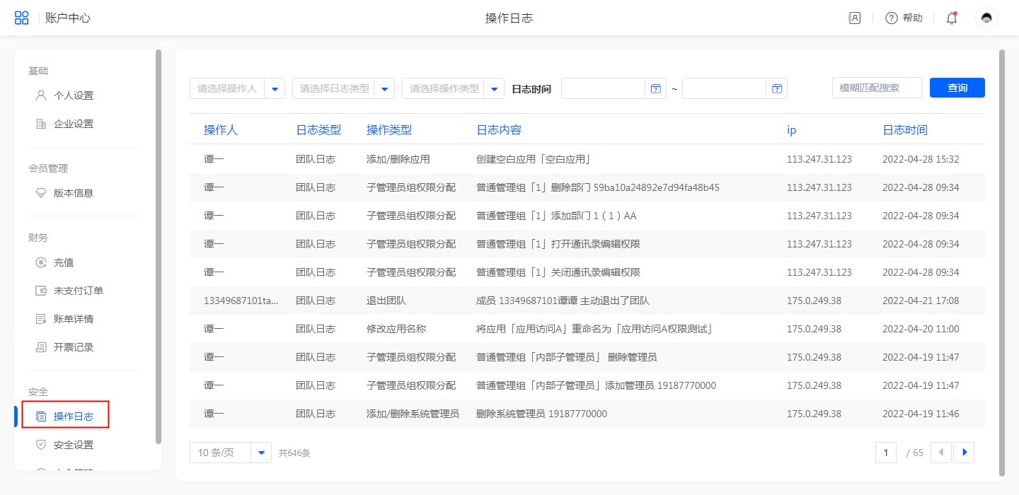 操作日志分为团队日志和个人日志,并支持查询。