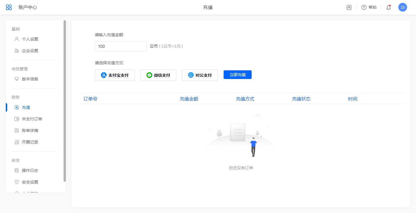 可查看当前账户所剩余额,如需充值,可点击【充值】按钮进行充值。