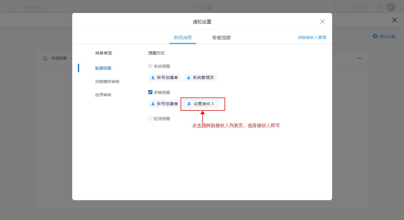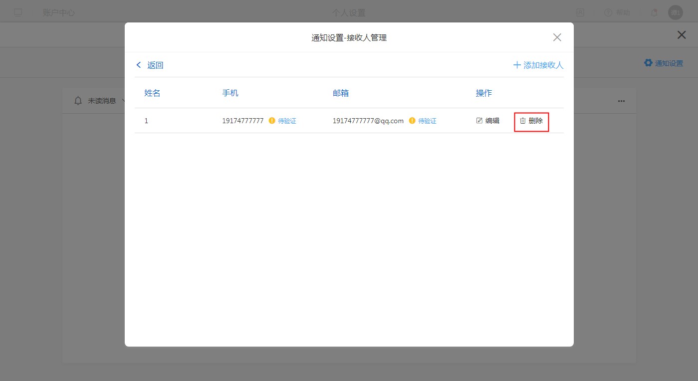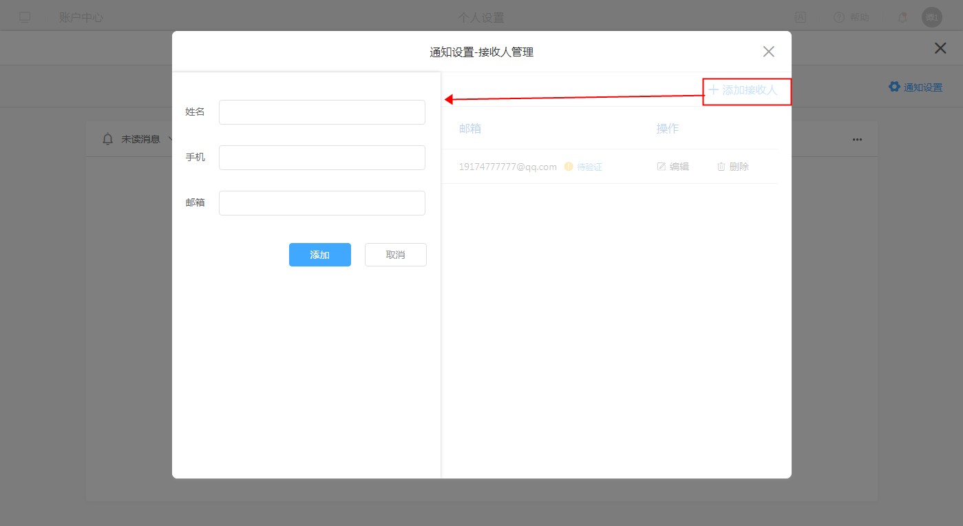 【消息中心】-【通知设置】-【消息接收人管理】,可以看到已经添加的消息接收人,也可以添加新的消息接收人。