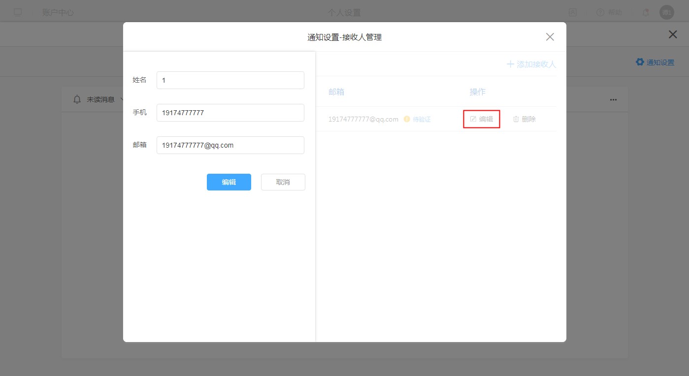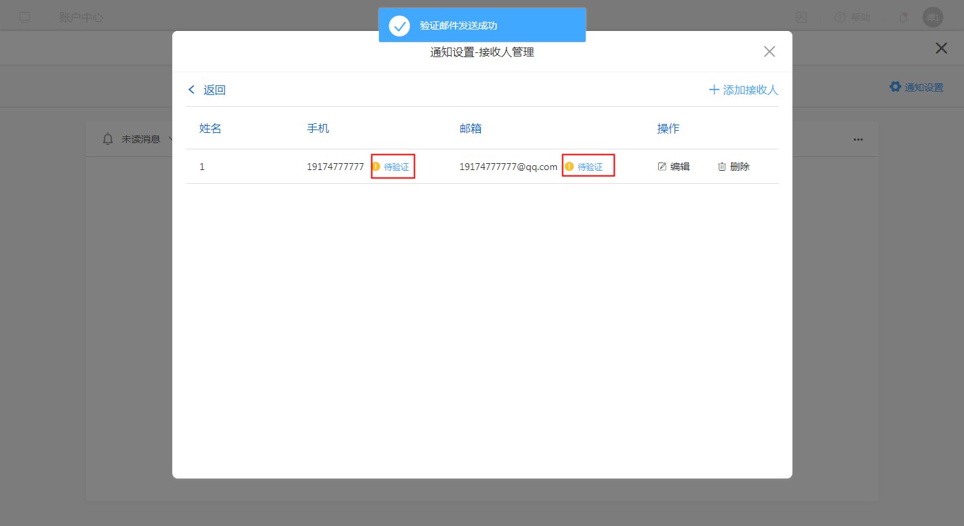 接收人管理中的邮箱和短信添加完以后需要进行信息正确性的验证。(点击[待验证]即可将验证信息发送到接收人手机上或者邮箱里)