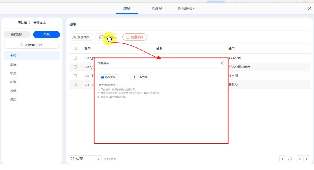 2、如果成员账号未激活,在导入时会提示该账号不存在,会导致导入不成功。