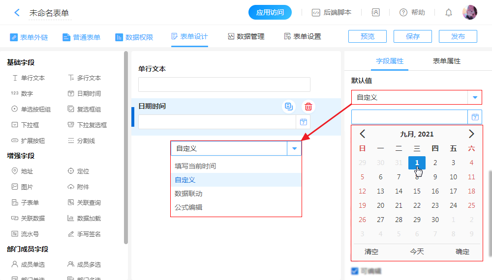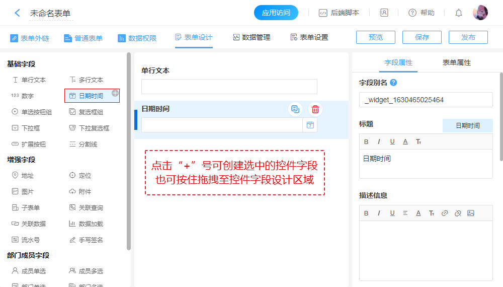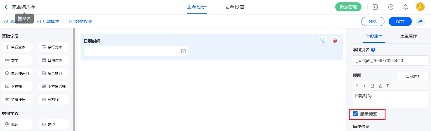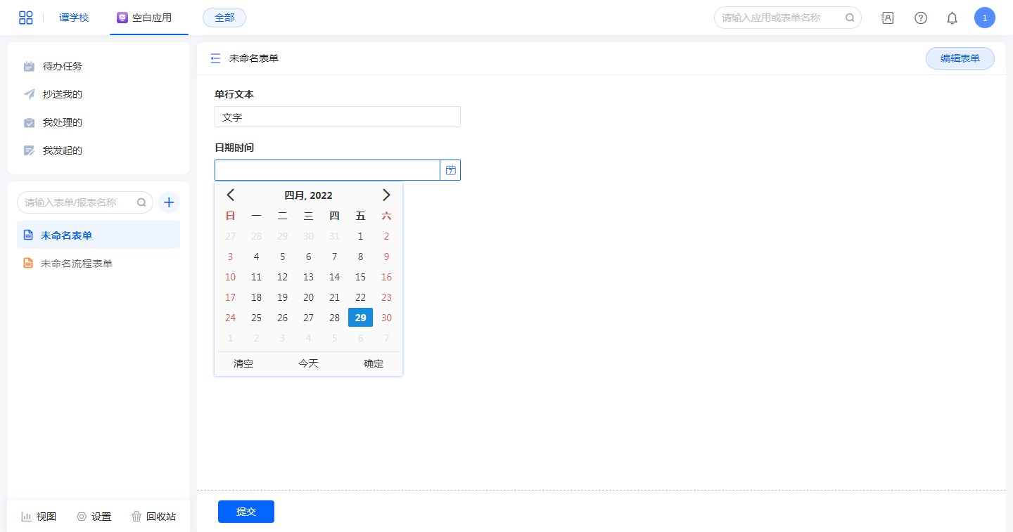 “日期时间”用于表单中选择日期或时间的字段填写。