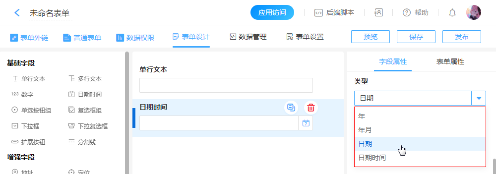 2. 支持日期类型填写限制。(默认:日期,可选:年、年月、日期时间)