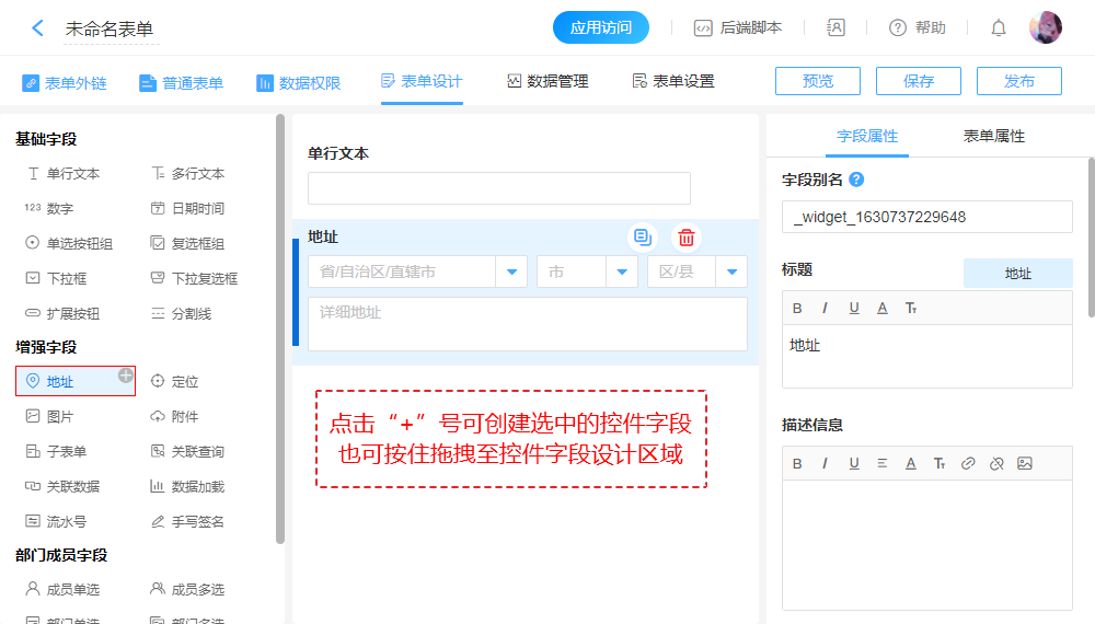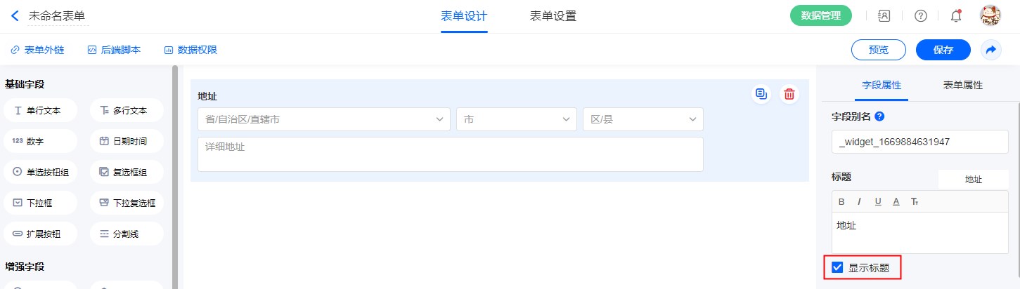 “地址”字段专门用来填写地址格式信息,其中“省、市、区”可以直接选择,无需手动填写,能够有效提高地址信息录入效率。