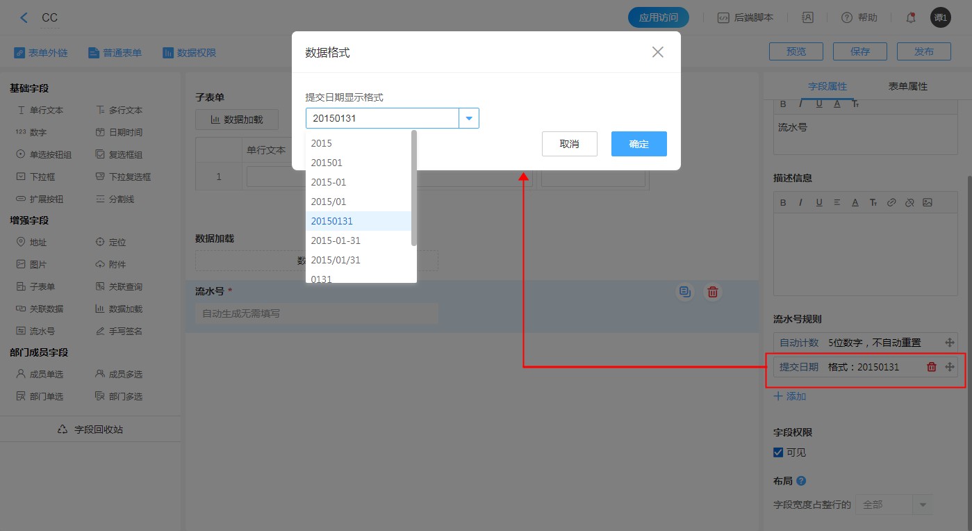 在使用流水号设计中,可能需要使用到表单中的字段来作为流水号的组成部分,那么添加表单字段即可实现。目前支持表单中的单行文本、数字、下拉框、单选按钮组作为流水号组成成分。