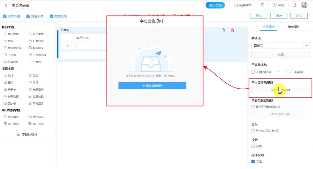 子表单支持设置「子字段显隐规则」,通过设置子字段(即子表单中的字段)显示条件,可以实现根据上一步选择的子表单字段选项,来决定下一步显示哪些字段。