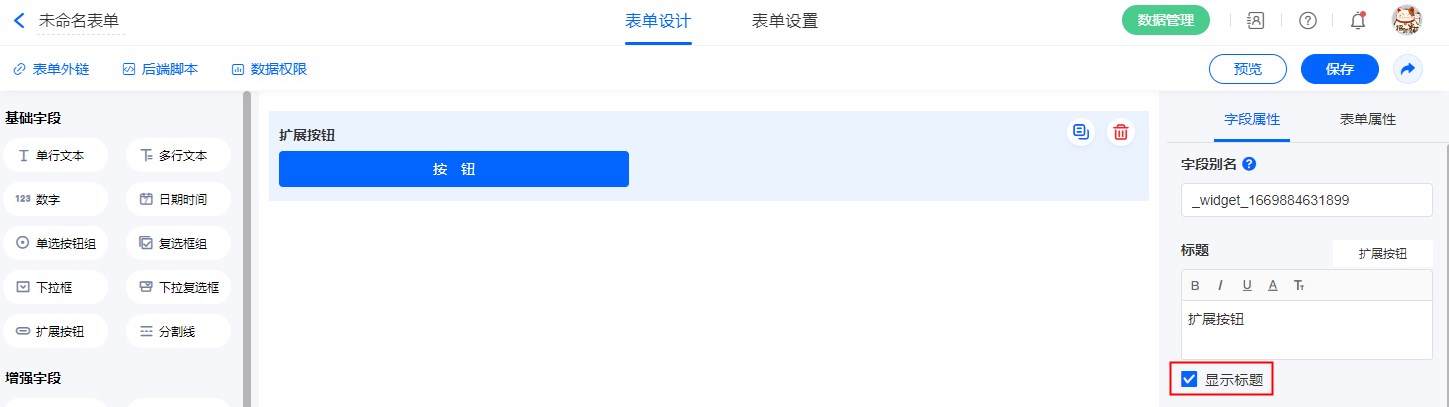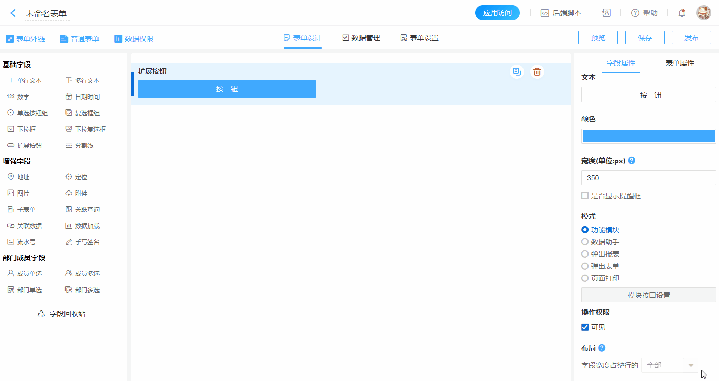 - 表单页面中创建一个独立按钮,用于执行“功能扩展”相关功能。